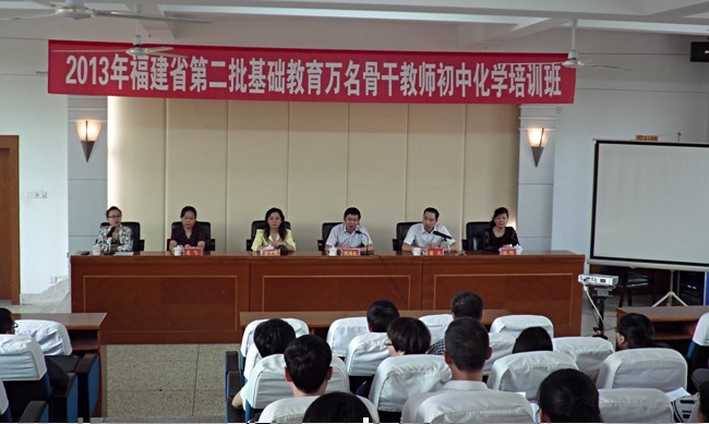 10月18日上午,2013年福建省第二批基础教育万名骨干教师初中化学培训班开班典礼在我校逸夫楼三楼报告厅举行,来自八闽各地的50名初中化学骨干教师学员将在我校接受为期10天的研修培训。这是我校获得“福建省基础教育万名骨干教师培训”初中化学和初中生物两个学科集中培训项目后迎来的首批学员。成教学院、化学系等部门领导、专家参加了本次骨干教师开班典礼。
